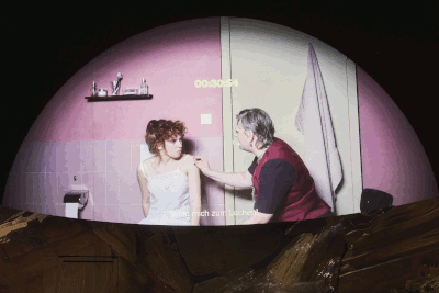Eurydike will sich also einfrieren lassen, und Orpheus beschließt da mitzumachen, lässt sich töten und ebenfalls einfrieren. Die Klinikleitung übergibt sie vorher noch an Hades (Franziska Hartmann) die aus unerfindlichen Gründen in Samthose, Schößchenjacke und einem riesigen federgeschmückten Hut gekleidet ist und aussieht, als ob sie gleich zum Stierkampf aufbrechen möchte. (Kostüme und Bühne: Anna Met) Und dann wird es ganz abstrus. Das Schlafzimmer der beiden Frauen befindet sich in einer Felsenlandschaft mit angedeutetem Wasserfall. Jetzt wird ein mobiler OP-Saal aufgestellt, in dem Ärzte ihre Handlungen vollziehen. Zwischendurch tanzt eine Mickey Mouse in einer Videoeinspielung als Hinweis auf das Gerücht, ihr Schöpfer Walt Disney hätte sich ebenfalls einfrieren lassen.