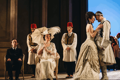 Die Inszenierung von David McVicar überzeugte durch ihre spielerische Leichtigkeit gepaart mit einer absichtlich historisch "verunstalteten" Übertragung der gesamten Handlung in die Zeit des europäischen Kolonialismus (Ägypten als britisches Protektorat, 1919-22).
