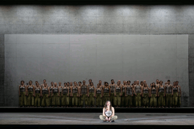 Die Bühne von Rufus Didwiszus ist steingrau und kahl, nur ein Bett und jede Menge rein und raus getragene Tische und Stühle bestimmen das Bild - und die sensationell spielenden und singenden Chorsolisten der Komischen Oper Berlin (dem mit Abstand besten der drei Opernchöre in Berlin).