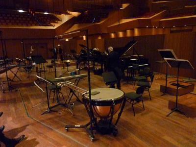 Überall ist Wunderland (2014) ist eine Neufassung für 19 Musiker - vom kompletten Ensemble Modern dargeboten - und wurde gestern Abend in dieser Fassung uraufgeführt. Von den 15 Minuten waren zwei dem Schweigen vorbehalten. Die Musiker nahmen im Saal ihren Platz ein und schauten regungslos ins Publikum, und so ging es auch zu Ende. In den verbleibenden 13 Minuten schickt Eimermacher die Musiker und das Publikum auf den GRA [der GRA ist ein Autobahnring um Rom, meistens verstopft; hier macht jeder, was er will, um ans Ziel zu kommen und ohne Rücksicht auf Verluste, und die einzige Verkehrsregel, die Gewicht hat, ist „Einschüchterung“. Schließlich kommen aber doch alle meistens an ihr Ziel]. Es beginnt mit zwei Noten, also Stau, alles stagniert, dann Hupen, Schimpfen, eine Ambulanz rast vorbei, die Polizei gleich hinterher, weiter weg hört man Zirkusgeräusche, und dann geht es zweimal an einer Schule vorbei. Zwischendurch stagniert der Verkehr wieder, und die zwei Anfangsnoten werden übernommen - die Komponistin hat dafür ein eigenes Perkussionsinstrument entworfen, das (abgesehen von den normalen Schlagzeugutensilien) aus Suppendosen, Metallstangen, Wassergläser, Schlagzeug und einer Art Glockenspiel bestand. Gleich dreimal stand es auf der Bühne, und sogar Frank Ollu (am Pult) musste mithelfen, um das Chaos nicht ausarten zu lassen. Sehr amüsant und - wie gesagt - , diese Komposition konnte einfach nur in Rom entstehen. Nach dem Ausklingen des letzten Tones – was gar nicht so leicht zu erkennen war, da die Suppendosen unter der Glocke noch nachhallten - neigten sich die Musiker 10 Zentimeter nach rechts, und wieder Schweigen - -dann ging das Licht aus und Ende. Witzig und Originell.