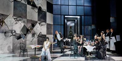 Noch sind die meisten Tische und Stühle besetzt. Dieselben erscheinen jedoch an der linken Wand noch einmal im Winkel von 90 Grad hochgeklappt – hier unbesetzt. Spiegelung einer alternativen Lebensform oder verrückte Realität – beim Tod des Täufers fallen die an der Wand hängenden Tische und Stühle dann dröhnend zu Boden. Doch der ersehnte Kopf des Jochanaan wird Salome schlussendlich nicht serviert, vielmehr bringt der Diener Salome, Herodes und Herodias schlussendlich die eigenen Köpfe auf dem Silbertablett.