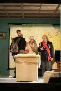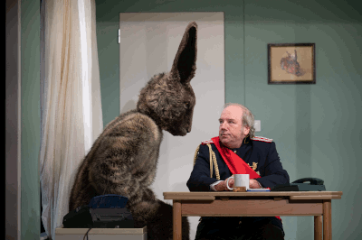 Es ist die konkrete Auffüllung, die solche Theorien absurd, gefährlich oder eben auch komisch macht. Deigner übernimmt für sein Exempel virulente Elemente wie den Antisemitismus und stellt sie in einen historischen Kontext. Manche Motive tauchen auf, die schon in Tankred Dorsts zu Unrecht vergessenem Toller eine Rolle spielten. Das war vor sechzig Jahren. Ihr Geist lebt weiter. Bei Deigner als Rudolf von Sebottendorf, ein weitgehend vergessener Rechtsradikaler „aus der Frühzeit der nationalsozialistischen Bewegung“ in der Verkleidung eines riesigen Hasen, der mit einem verschwurbelten Monolog das Stück eröffnet.