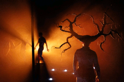 Später gibt der Bereich auf der rechten Bühnenseite den Blick auf einen Innenraum frei, der an ein Beerdigungsinstitut oder ein Krematorium erinnert (Bühne & Video: Antonín Šilar). Eine platzierte Anrichte schafft Assoziationen zu einem Sarg. Innerhalb dieser rechten Spielebene verkörpern vier weitere Figuren die Elemente Feuer, Wasser, Erde und Luft. Gedanken der Trauernden gehen nun sozusagen als innere Anteile über in Stimmen der Elemente. Diese geben jedoch den Gedankenwelten der Trauernden auch einen anderen Fokus oder eine andere Richtung. Ein Manko der Inszenierung ist hier, dass die Elemente nicht nur aufgrund der Kostüme in recht zurückhaltenden Bildern verkörpert werden. So setzt Zainab Alsawah als Element Wasser wiederholt Teewasser auf. Kristin Steffen hustet als Element Luft mehrfach. Peter Fasching zündelt als Element Feuer mit einem Feuerzeug. Matthias Max Herrmann hebt als Erd-Element Schnee vom Boden auf und trägt verschmierte Erdfarben auf seinem Hemd. Tatsächlich spielen eben diese vier Elemente auch beim Sterben eine zentrale Rolle.