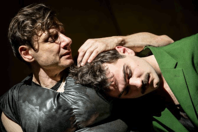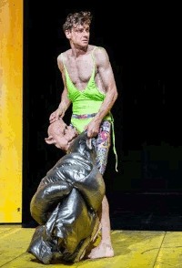 Er wirft sich in Pose und positioniert sein durchscheinendes Hemd so, dass seine beeindruckende Bauchmuskulatur hervorsticht. Ed (Daniel Stock) freut sich auf seine Verabredung. Er strahlt Harri (Paul Michael Stiehler) einladend entgegen, als dieser auf hochhackigen Herrenplateauschuhen tänzelnd eintrifft. Offensichtlich hatten beide vor, intim miteinander zu werden. Doch wen hat Harri da im Schlepptau, auf den er entschuldigend hindeutet? John Falstaff (Sören Wunderlich) scheint durch eine dicke Oberkörperumhüllung sichtlich beeinträchtigt, bewegt sich tapsig und wirkt derangiert. Ed ist sichtlich wütend. Prompt meint Falstaff, er müsste vor dem Kennenlernen noch ein gewisses Örtchen aufsuchen und tritt durch eine Tür im Bühnenhintergrund ab. Ed ruft eifersüchtig aus, Harri solle sich doch wenigstens einen wohlhabenden Gönner angeln, wenn er sich schon einen Sugar Daddy zulege. Harri zärtelt an Ed herum und meint beschwichtigend lächelnd, Falstaff sei aber ein guter Zuhörer und unterhaltsam. Beide werden noch ein böses Spiel mit Falstaff spielen, das jedoch auch für sie böse enden könnte.