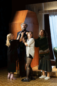 Regisseur Petras lässt in der letzten Premiere seiner Amtszeit als Cottbuser Schauspiel-Kodirektor sein Ensemble an der langen Leine überdrehen. Tschechows Tragikomödie gerät dabei mit dem passenden Zeitgeistvokabular zunehmend zur Gegenwartsfarce. Während die einen übertrieben posen, ergeht sich der verhinderte Macher Lopachin in einem furiosen Percussion-Slapstick, bei dem er neben dem Schlagzeug auch noch die gesamte Kulisse bearbeitet. Seine unglückliche Dauerverlobte Charlotta lässt derweil, auf den Richtigen wartend, ihre Eier einfrieren. Student Peter wird in einer Videoprojektion (Rafael Ossami Saidy) auf den Vorhang im Hintergrund Kippenberger-reif mit Froschmaske ans Kreuz genagelt. Als Firs gibt Kai Börner noch einige DDR-Spruchweisheiten zum Besten. Mit viel Liebe fürs unkonventionelle Theater lässt der Autor und Regisseur seine Personen wie um ihr Leben spielen und trotzdem untätig dem nahenden Unglück entgegentaumeln. Das tritt dann vor der Pause auch als großer Knall mit Atompilz in der Videoprojektion ein.