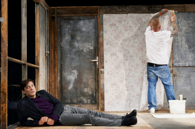 Regisseur Lukas Holzhausen nähert sich den zum Teil recht drastischen Schilderungen in Barons Roman, indem er die Figur des Vaters nur als stumm anwesende Person zeigt. Der Zimmermann Michael „Minna“ Sebastian baut während des ganzen Abends das Bühnenbild, ein Zimmer mit Wänden, Fenstern und Türen. Er tapeziert und rollt den Teppich aus. Sogar die Waschmaschine, die der Vater allein in den 4. Stock schleppen konnte, steht da. Seine Äußerungen, in denen er die Mutter beschimpft und erniedrigt, kommen aber von Jan Thümer aus dem Off. Das nimmt den im Pfälzer Dialekt gesprochenen Worten zwar nicht die Wucht, vermeidet aber die Bebilderung der Gewalt. Sebastian steht nicht nur für die Kraft des Vaters, sondern auch als Projektionsfläche für die Wut des Jungen und späteren Reflexionen des erwachsenen Christian. In einer Szene sitzt er auch nur ganz hilf- und wehrlos am Boden, während Nikolai Gemel als Christian erzählend durch die Geschichte führt.