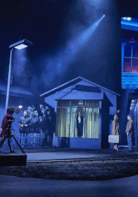 Das aufwendige und detailreiche Bühnenbild von Pia Maria Mackert zeigt eine Häuserlandschaft mit einer kleinen Kirche im Zentrum. Im Vordergrund fährt regelmäßig neben einem Fußweg eine Kamera entlang. Diese projiziert auf zwei Großbildschirmen rechts und links oberhalb der Bühne Live-Eindrücke, auch vom teilweise nicht für das Publikum sichtbaren Innenleben in den Bauwerken. Die Kamera projiziert auch Bilder aus nur schemenhaft erahnbaren Anbauten im Hintergrund, wie etwa aus einem Gewächshaus. Zu Beginn geht eine Frau (Lavinia Nowak) von links nach rechts und dreht sich dabei, wie in Gedanken, zur Kamera. Sie öffnet eine Haustür und fährt die Innenjalousien hoch. In ihrem büroähnlichem Setting begegnet sie einigen bedeutungsvoll miteinander schweigenden Figuren. In einem anderen Haus kleiden sich zwei ältere Herren an, der eine (Andreas Beck) drückt dem anderen (Thomas Dannemann) Geldscheine in die Hand. Diese Szenenabfolge wiederholt sich in veränderter Weise und mit neuen Akzentsetzungen dreimal.