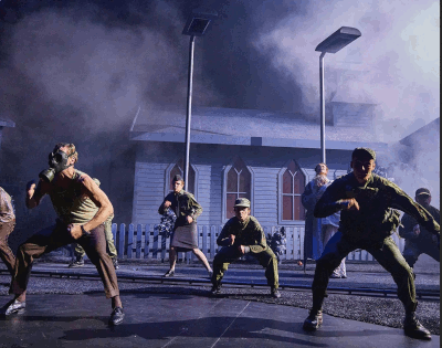 Die diffus bleibende Handlung, in der verwirrend viele Figuren bald Soldatenuniformen tragen (Kostüm: Mona Ulrich), wird danach immer abstruser. Ein eventuelles Kriegsgeschehen oder eine gesellschaftliche Disruption werden vorsichtig angedeutet. Ein potentieller Kriegsheimkehrer (Paul Grill) bricht am Weg weinend zusammen, pinkelt in ein Planschbecken und verfolgt eine junge Frau (Rebekka Biener). Stimmungsvolle Popsongs sollen die Begebenheiten mit Pathos oder Bedeutsamkeit aufladen, wir hören „Alone“ von The Cure, „Gobbledigook“ von Sigur Ros und „Armenia“ von den Einstürzenden Neubauten. „Personal Jesus“ von Depeche Mode oder „Who by fire“ von Leonard Cohen wurden von Tommy Finke für die Produktion bearbeitet. Sie werden neben eigenem, noch unveröffentlichtem Material vom Musik- und Sounddesigner Finke eingespielt.