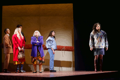 Dass das irgendwie auch etwas nach modernem Tschechow klingt, ist von der Autorin durchaus beabsichtigt. Und da gibt es hier neben den nach Glück und Liebe sehnsüchtigen Frauen (wie bei den Drei Schwestern) auch so etwas wie ein Kirschgarten-Ende. Das Haus soll abgerissen oder umgebaut werden. Wohin die Reise geht, wissen die auf gepackten Koffern Sitzenden aber auch noch nicht. Eine kleine Reminiszenz darauf, dass Regisseur Erpulat zu Beginn der Intendanz von Shermin Langhoff Tschechows Kirschgarten hier inszeniert hat. Nun lässt er sein Ensemble in dem engen Drehbühnenbild von Magda Willi von Zimmer zu Zimmer wandern und Episoden aus dem Roman mit Hang zum Slapstick spielen. An den Schultern stark ausgepolstert (Kostüme: Miriam Marto) sehen alle ein wenig wie Karikaturen aus den 1980er Jahre aus. Sie spielen eine sozialistische Wartegemeinschaf, die geduldig in der Schlange steht, obwohl keiner weiß, was es gibt. Ein langer Teppich im Bus wird über den Köpfen jongliert. Für einen Sturm zerren Çiğdem Teke und Doğa Gürer einfach nur an ihren Kostümen.