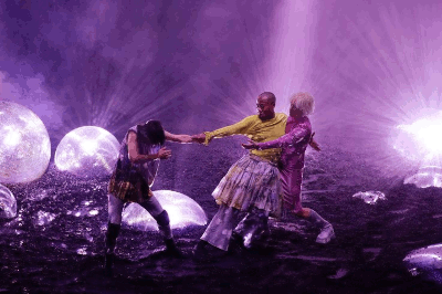 Das Beste von dem Ganzen war dann allerdings das Bühnenbild von Nadia Lauro mit ungefähr zwei Dutzend auf schwarzem Splitt herumliegender Disco-Halbkugeln unterschiedlicher Größe, das durch die Beleuchtung von Nico de Rooij eine glitzernde und aus sich herausstrahlende Mondlandschaft assoziierte und diverse visuelle Fantasien freizusetzen in der Lage war.