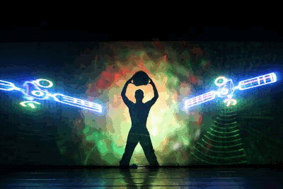 Die Bewegungen der Akteure akzentuieren sich bald vor einem abstrakten Gitternetz aus Linien. Schattige Umrisse und Silhouetten verflechten sich mit Leuchtmaterialien. Requisiten beginnen im schattenhaften Raum zu funkeln. Eine Figur hebt eine leuchtende Kugel empor. Details erwachen zum Leben und verformen sich. Der dunkle Hintergrund sorgt für Täuschungen. Akteure mit leuchtenden Accessoires werden emporgehoben. Es sieht aus, als würden diese durch den Raum schweben. Wechselnde Szenen und Disziplinen, zeitgenössischer Tanz und artistische Bühnenvisionen nehmen Geschwindigkeit auf.