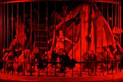 Der Hörselberg im TANNHÄUSER als Käfig, woheraus Stephanie Friede (als geschwängerte Venus) kräftig ragt - Foto (C) Bayreuther Festspiele GmbH / Enrico Nawrath