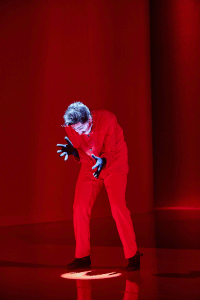 Als sich der samtig rote Theatervorhang öffnet, ist auch die Bühne atmosphärisch in warme Rottöne getaucht. Ein herzschlagähnlicher Rhythmus eines Metronoms erklingt. Auf der ansonsten leeren Bühne bewegt sich ein schwarzer zeltähnlicher Aufbau auf und ab. Wenige Augenblicke später fährt  ein auf einem ferngesteuerten Podest platzierter Scheinwerfer (Lichtdesign: Voxi Bärenklau) auf der Bühne hin und her. Der bewegliche Strahler verschafft sich Raum, indem er sich in mehrere Richtungen bewegt. Er strahlt nacheinander Bühnendecke, Publikum und die Bühnenseiten an. Zelt und Strahler kreisen minutenlang umeinander und aneinander vorbei. Erst einige Augenblicke später springen nacheinander sieben Akteure aus dem Zelt hervor.