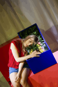 Marco Pinheiros ebenerdige Bühne in der Frankfurter Box ist für Maren Kames’ Coming of Age-Geschichte mit farbigen Rechtecken oder Klötzen bunt gestaltet. Die Klötze warten mit Besonderheiten wie einem Innenleben auf, das die beiden auftretenden Figuren entdecken. Bei einem größeren Klotz blicken die Figuren bedeutungsvoll aus einem mittig platzierten Glas-Bullauge, wie von einer Waschmaschine. In einem anderen Klotz entdeckt die Ich-Erzählerin einen Plattenspieler.