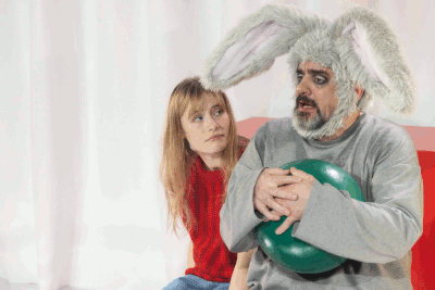 Weniger sensibel und nachdenklich wirkt hingegen ihr eigenwilliger Begleiter und regelmäßig auftauchendes Gegenüber, der spielfreudige Hase - Sebastian Reiß verkörpert ihn mit großen Hasenohren und später einer Hasenmaske. Er turnt um die Protagonistin herum, flachst ausgelassen. Er bietet der Ich-Erzählerin einen Lolli an und genehmigt sich selbst einen. Prompt beißt er seinen Lutscher ab und muss kurz schlucken. Er lenkt die Protagonistin ab, indem er ihr auch einen Fisch an einer Angelschnur oder ein Fernrohr reicht. Er konfrontiert sie dabei mitunter auch frech mit einer Sinnlosigkeit ihrer Reflexionen.