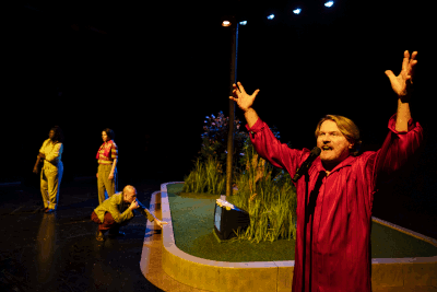 Marina Galic ist dann auch das Kraftzentrum dieser gut gelaunt aufspielenden Inszenierung, die aber in den gut zwei Stunden eine ganze Menge an Text über die Rampe schieben muss. Die weiteren Rollen teilen sich Jannik Mühlenweg, Joyce Sanhá und Peter Moltzen, der über weite Teile des Abends die zunehmend dement werdende Großmutter Kristina spielt. Das setzt auf den teils recht witzigen Text von Stanišić auf, überspannt aber ein ums andere Mal etwas den Bogen. Die vier teilen sich den Text und spielen sich dabei die Bälle zu. Das macht durchaus Spaß beim Zusehen, ermüdet aber auch etwas, je weiter der Abend voranschreitet. Von der Geburt 1978 in der bosnischen Stadt Višegrad an der Drina über die Erlebnisse beim Besuch der Familie im kleinen bosnischen Dorf Oskoruša mit dem Brunnen des Urgroßvaters bis zum Krieg und der Flucht nach Deutschland behandelt der Abend immer wieder die Begriffe Heimat und Zugehörigkeit, die für Saša nie so eindeutig zu klären sind.