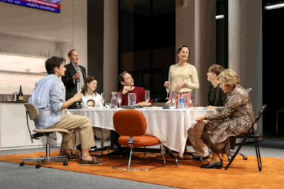 Seiner munteren Familie ist dieser Ödipus zugewandt und verständnisvoll. Als sein Sohn Polyneikes (Dominikus Weileder) sein Schwulsein offenbart, freut sich Ödipus für und mit ihm. Eine Paraderolle hat auch Rita Russek als seine -vermeintliche – Mutter Merope. Sie will ihm seine Herkunft erklären, aber dafür ist die Zeit noch nicht gekommen, deshalb wimmelt er sie immer wieder freundlich ab.