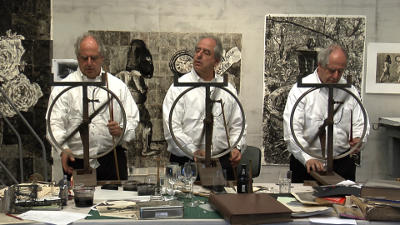 Kentridge vergleicht Robespierre mit dem Sarastro aus Mozarts Zauberflöte, die er 2005 in Brüssel inszeniert hat, und hat noch so manch anderen Querverweis aus der Kunstgeschichte von Dürers Rhinozeros bis zu Picassos Faible für afrikanische Masken auf Lager. All das findet sich in Kentridges Kunst wieder. Der Künstler nennt das selbst „Lob des Synkretismus“. Auch eine Synthese von Zeichnung und verschiedenen Methoden, bewegte Bilder zu erzeugen (wie etwa mit dem Zoetrop oder der Filmkamera). Kentridge erklärt den Ablauf von Bewegung, Projektion und Illusion. Wir schauen ihm im Video bei der Arbeit zu, wie er sich selbst als Double Hinweise gibt. Das Prinzip des schauenden und handelnden Künstlers im Atelier, dem Raum für die „notwendige Dummheit“, die wiederum Raum für unvoreingenommene Ideen und Gedanken schafft.